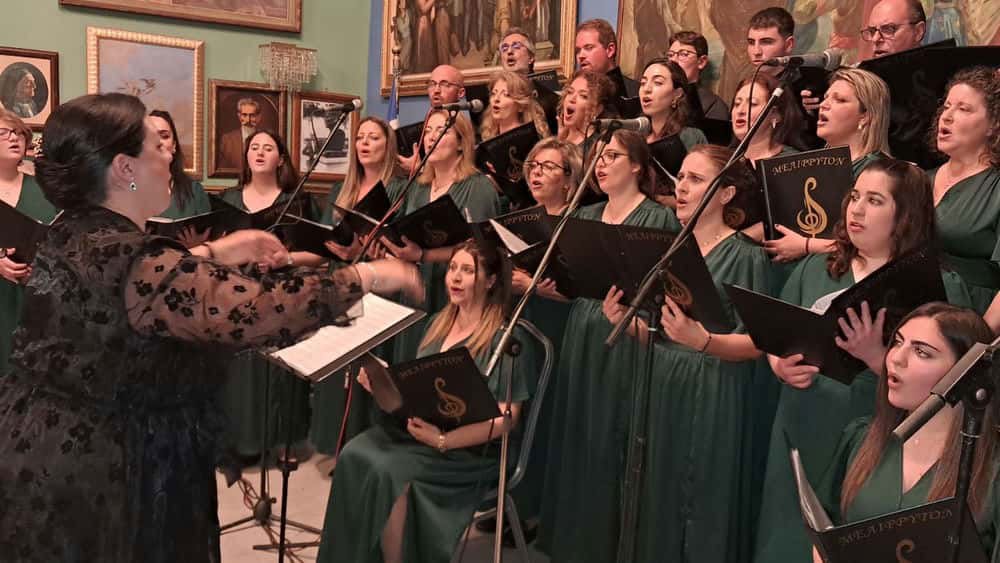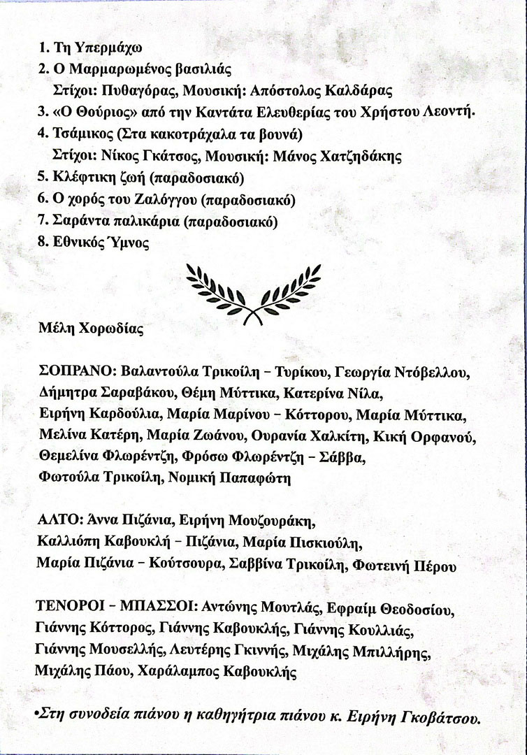 Στο δεύτερο μέρος της εκδήλωσης το νέο πολυφωνικό σχήμα του νησιού μας με την επωνυμία «Μελίρρυτον», υπό τη διεύθυνση της καθηγήτριας μουσικής κας Τρικοίλη – Καβουκλή Ειρήνης απέδωσε με ένα μοναδικό τρόπο ύμνους και τραγούδια σχετικά με την επέτειο. Τη χορωδία συνόδευσε στο πιάνο η καθηγήτρια πιάνου κα Ειρήνη Γκοβάτσου. Το μουσικό αποτέλεσμα, προϊόν πολύμηνης προετοιμασίας, ήταν άψογο και άφησε τις καλύτερες εντυπώσεις . Η επιλογή του Αναγνωστηρίου για την παρθενική εμφάνιση του νέου μουσικού σχήματος τιμά το Σωματείο μας και αποτελεί απόδειξη της εκτίμησης που αυτό απολαμβάνει.
