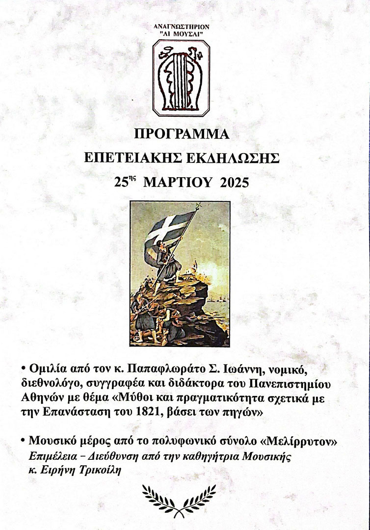 Ο κ. Παπαφλωράτος νομικός, διεθνολόγος, συγγραφέας, διδάκτορας του Πανεπιστημίου Αθηνών και καθηγητής των Στρατιωτικών μας Σχολών ανέπτυξε το θέμα «Μύθοι και πραγματικότητα σχετικά με την Επανάσταση του 1821, βάσει των πηγών». Ο ομιλητής έχοντας πλήρη γνώση των ιστορικών γεγονότων, μετά από πολυετή μελέτη πρωτογενών αρχειακών πηγών, καθήλωσε το κοινό με μία καλά δομημένη ομιλία, η οποία υποστηριζόταν και από το αντίστοιχο εποπτικό υλικό. Οι αναφορές του σε πρόσωπα και γεγονότα σκοπό είχαν να διασαφηνίσουν την αλήθεια και να προσφέρουν στο ακροατήριο καθαρή γνώση, πέρα από ακαδημαϊκά στερεότυπα και ορολογίες. Η παρουσία του στο βήμα του Αναγνωστηρίου αποτέλεσε ιδιαίτερη τιμή για το Σωματείο και το νησί μας.