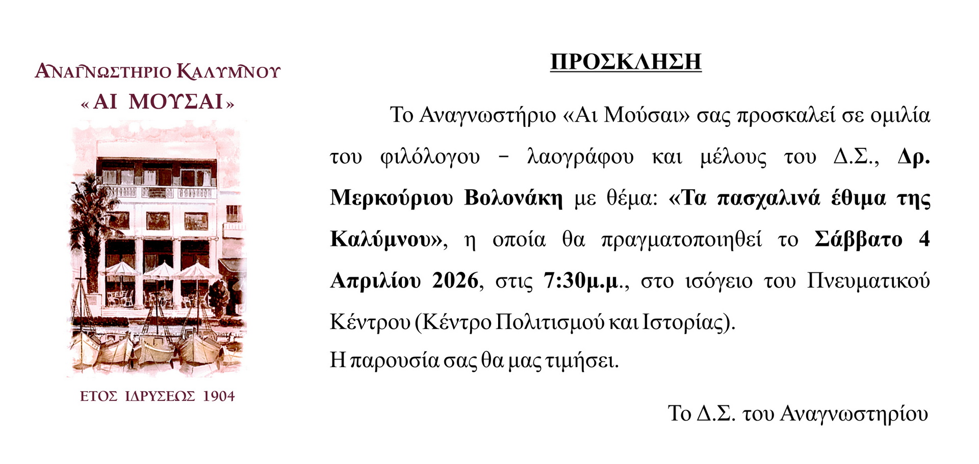 Το Αναγνωστήριο “Αι Μούσαι” σας προσκαλεί σε ομιλία του φιλόλογου – λαογράφου και μέλους του Δ.Σ., Δρ. Μερκούριου Βολονάκη με θέμα: “Τα πασχαλινά έθιμα της Καλύμνου”, η οποία θα πραγματοποιηθεί το Σάββατο 4 Απριλίου 2026, στις 7.30 μ.μ., στο ιόγειο του Πνευματικού Κέντρου (Κέντρο Πολιτισμού και Ιστορίας).