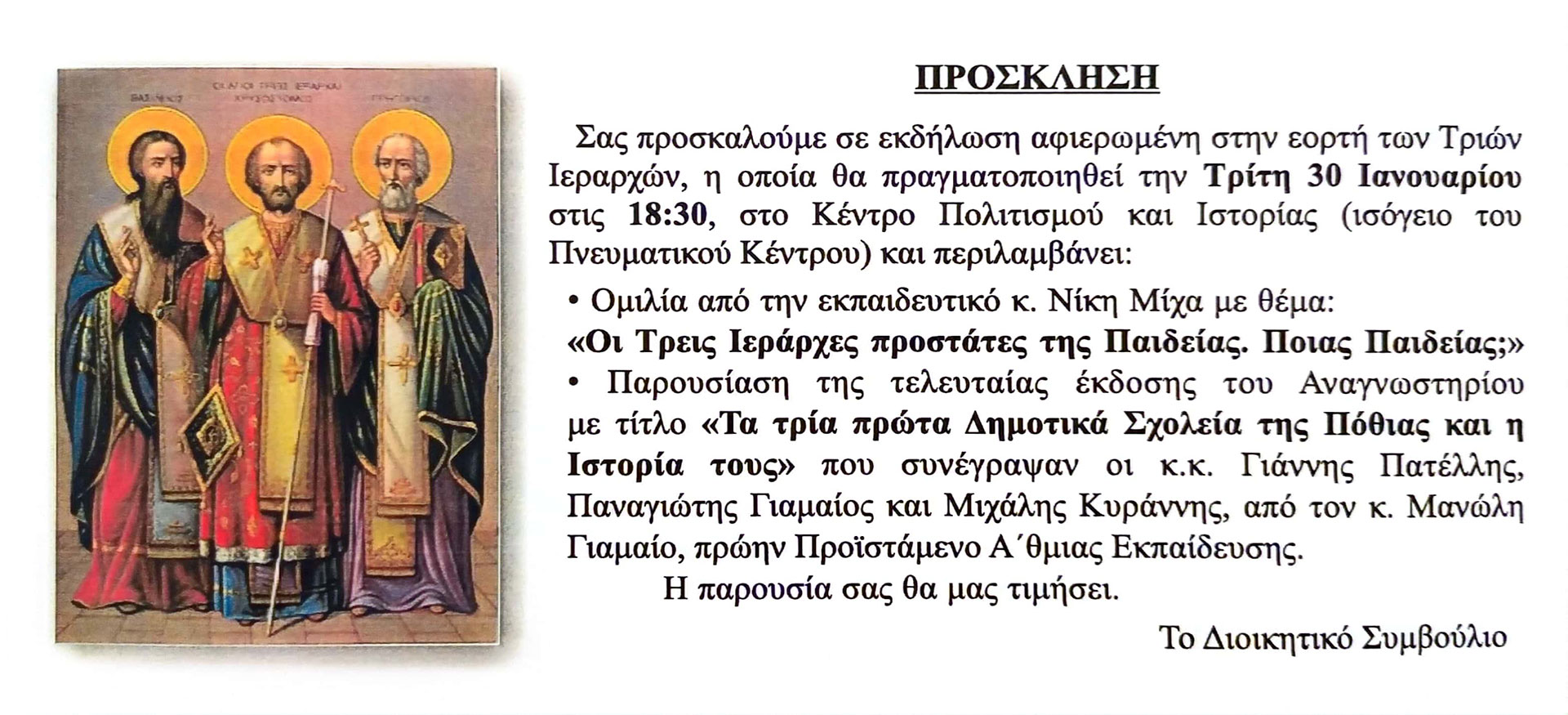 Σας προσκαλούμε σε εκδήλωση αφιερωμένη στην εορτή των Τριών Ιεραρχών, η οποία θα πραγματοποιηθεί την Τρίτη 30 Ιανουαρίου στις 18:30, στο Κέντρο Πολιτισμού και Ιστορίας (ισόγειο του Πνευματικού Κέντρου) και περιλαμβάνει: