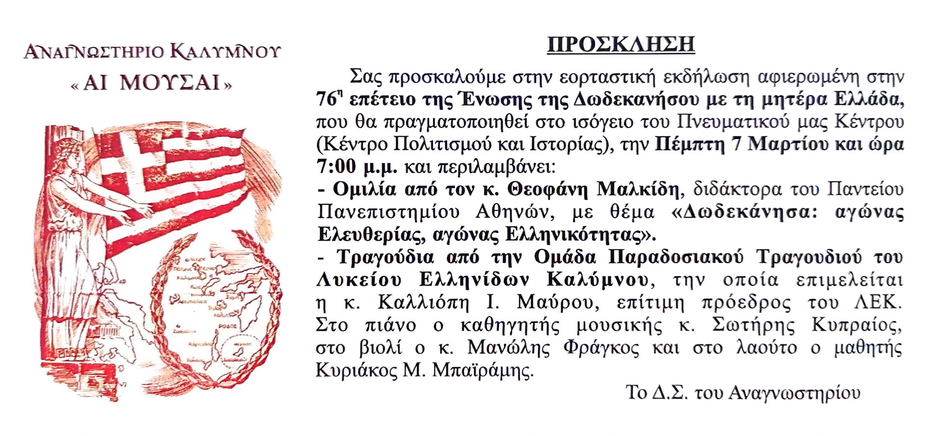 Σας προσκαλούμε στην εορταστική εκδήλωση αφιερωμένη στην 76η ετέτειο της Ένωσης της Δωδεκανήσου με τη μητέρα Ελλάδα, που θα πραγματοποιηθεί στο ισόγειο του Πνευματικού μας Κέντρου (Κέντρο Πολιτισμού και Ιστορίας), την Πέμπτη 7 Μαρτίου και ώρα 7:00 μ.μ. και περιλαμβάνει: