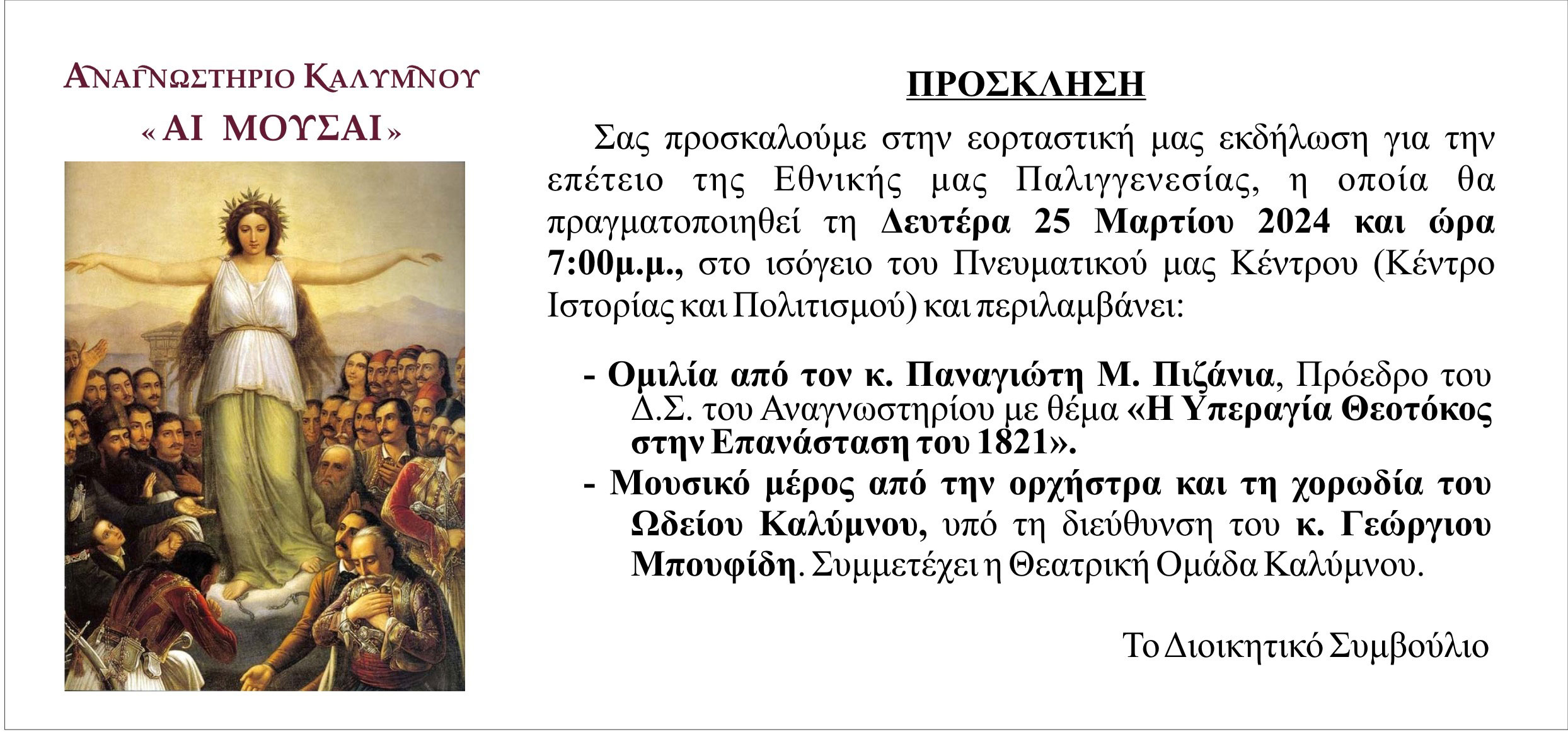 Σας προσκαλούμε στην εορταστική μας εκδήλωση για την επέτειο της Εθνικής μας Παλιγγενεσίας, η οποία θα πραγματοποιηθεί τη Δευτέρα 25 Μαρτίου και ώρα 7:00 μ.μ., στο ισόγειο του Πνευματικού μας Κέντρου (Κέντρο Ιστορίας και Πολιτισμού) και περιλαμβάνει: