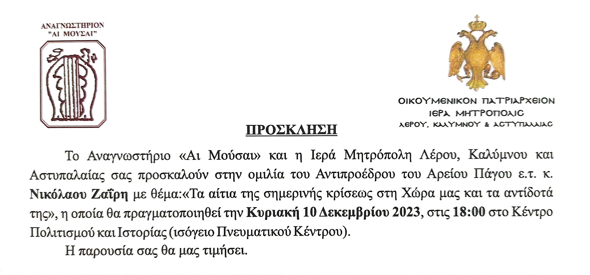Το Αναγνωστήριο “Αι Μούσαι” και η Ιερά Μητρόπολη Λέρου, Καλύμνου και Αστυπαλαίας σας προσκαλούν στην ομιλία του Αντιπροέδρου του Αρείου Πάγου ε.τ. κ. Νικόλαου Ζαΐρη με θέμα: “Τα αίτια της σημερινής κρίσεως στη Χώρα μας και τα αντίδοτά της”, η οποία θα πραγματοποιηθεί την Κυριακή 10 Δεκεμβρίου 2023, στις 18:00 στο Κέντρο Πολιτισμού και Ιστορίας (ισόγειο Πνευματικού Κέντρου).