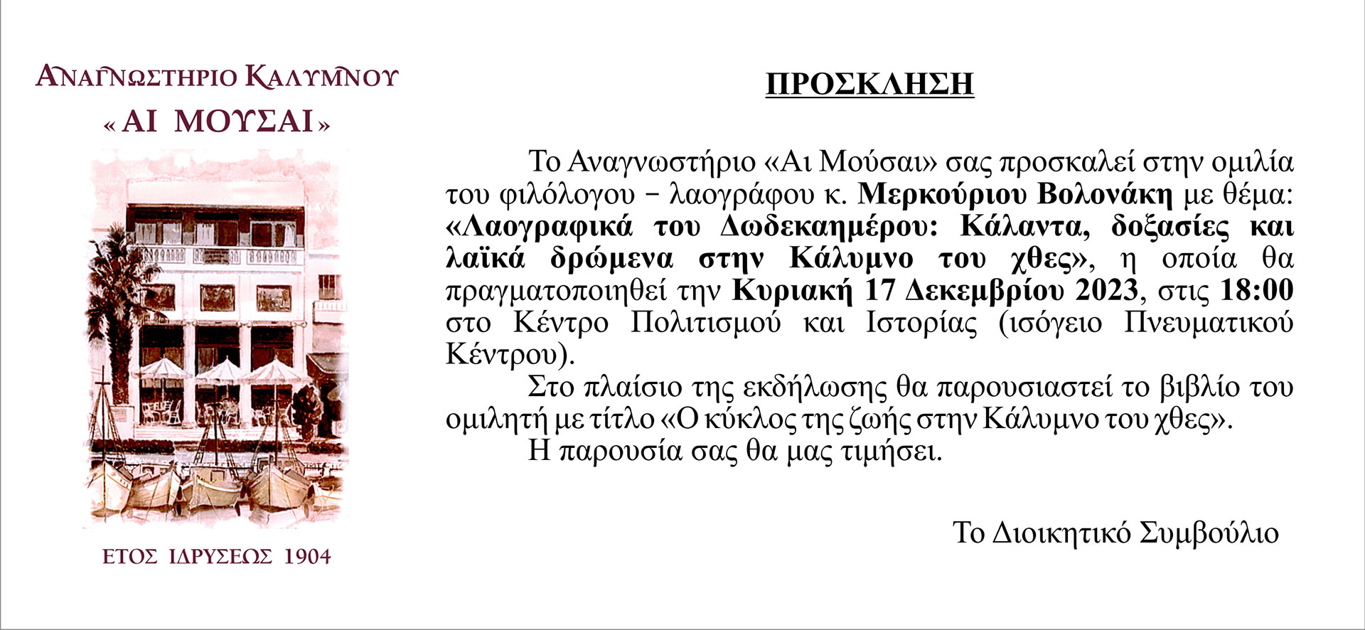 Το Αναγνωστήριο “Αι Μούσαι” σας προσκαλεί στην ομιλία του φιλόλογου – λαογράφου κ. Μερκούριου Βολονάκη με θέμα: “Λαογραφικά του Δωδεκαημέρου: Κάλαντα, δοξασίες και λαϊκά δρώμενα στην Κάλυμνο του χθες”, η οποία θα πραγματοποιηθεί την Κυριακή 17 Δεκεμβρίου 2023, στις 18:00 στο Κέντρο Πολιτισμού και Ιστορίας (ισόγειο Πνευματικού Κέντρου).