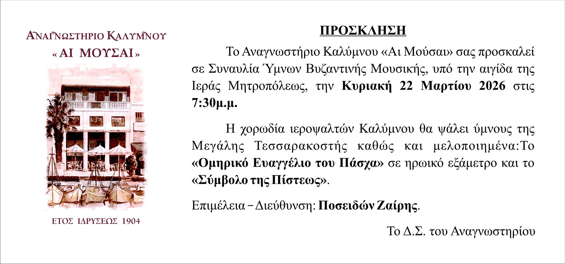 Το Αναγνωστήριο Καλύμνου “Αι Μούσαι” σας προσκαλεί σε Συναυλία Ύμνων Βυζαντινής Μουσικής, υπό την αιγίδα της Ιεράς Μητροπόλεως, την Κυριακή 22 Μαρτίου 2026 στις 7:30 μ.μ.