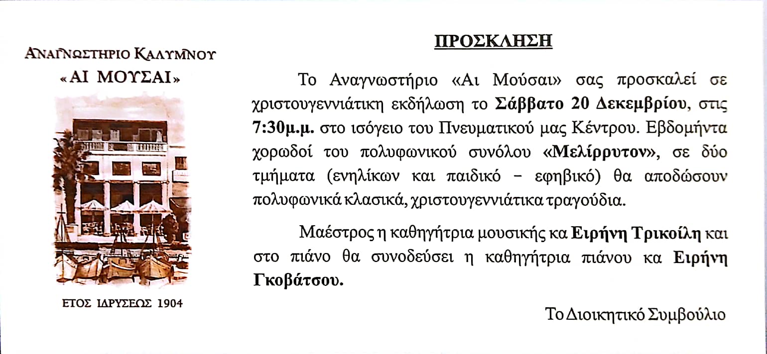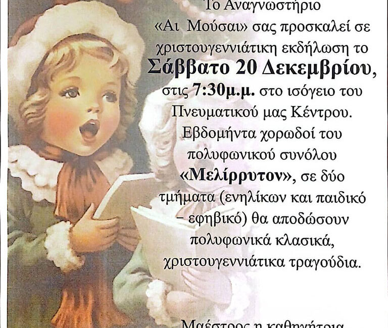 Το Αναγνωστήριο “Αι Μούσαι” σας προσκαλεί σε χριστουγεννιάτικη εκδήλωση το Σάββατο 20 Δεκεμβρίου, στις 7:30 μ.μ. στο ισόγειο του Πνευματικού μας Κέντρου. Εβδομήντα χορωδοί του πολυφωνικού συνόλου “Μελίρρυτον”, σε δύο τμήματα (ενηλίκων και παιδικό – εφηβικό) θα αποδώσουν πολυφωνικά κλασικά, χριστουγεννιάτικα τραγούδια.